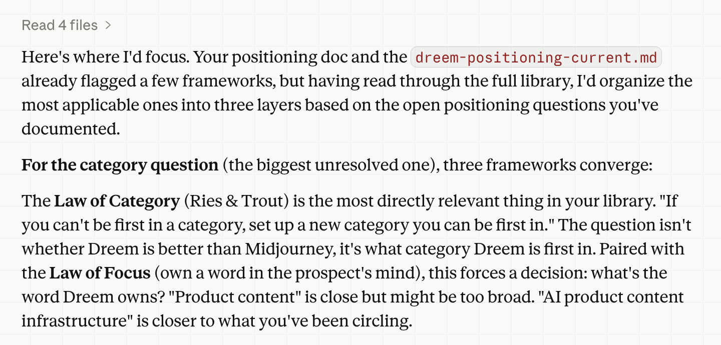 Think back to my positioning question at the start of this issue. Three weeks before I built FRAMEWORKS.md, I would have had to search my own notes, remember which book had the relevant framework, dig it out, and explain it to Claude before it could use it. Instead I asked a question, and the answer came from my own reading history without any of that.