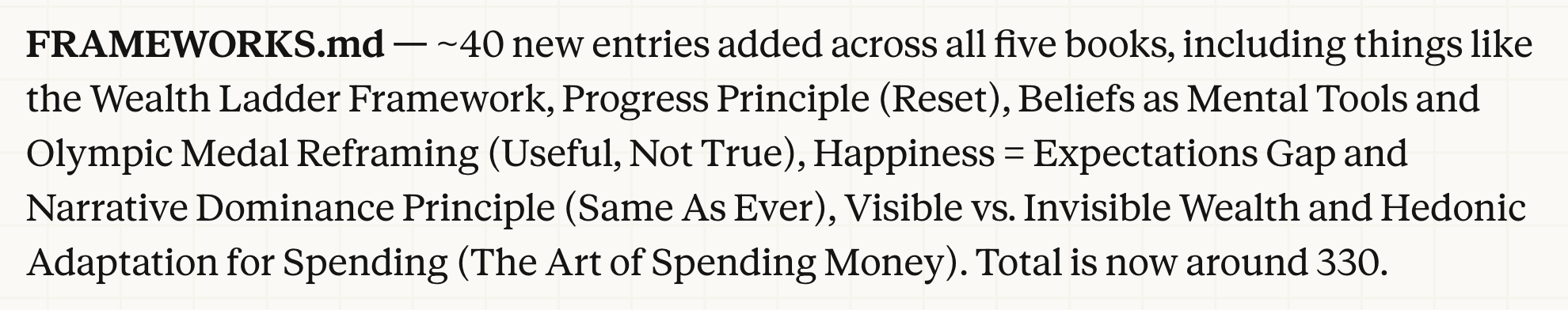 Here’s a sample of what came out when I ran it against five books I’d never extracted from—Reset, Same As Ever, The Art of Spending Money, Useful, Not True, and The Wealth Ladder: