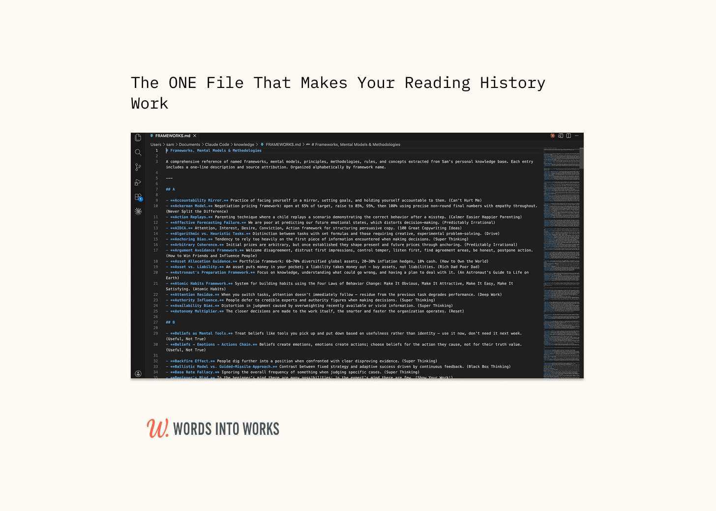 Asking Claude to build FRAMEWORKS.md—and BENCHMARKS.md if you want to go further—is the extraction layer that turns your reading history into something Claude can reason from.
